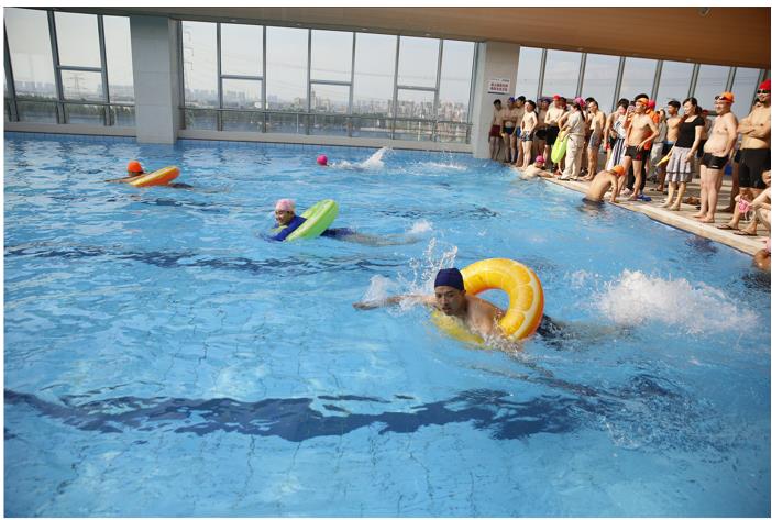 笑鬧之後賽程進入最後環節:花樣接力賽。每隊選派4名隊員完(wán)成4×50米接力。蛙泳、蝶泳、仰(yǎng)泳、自由泳,各類泳姿在泳池中激(jī)起了翩翩浪花。此項環節(jiē)的重頭戲(xì)在於每(měi)組需有一名隊員全程套著遊泳(yǒng)圈完成!這可難倒了遊泳健將們,於是,有(yǒu)的便(biàn)開(kāi)啟了長久的(de)原地圓周運動模式,隊友不得不下水接應。