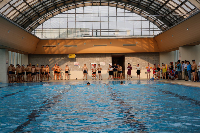 男子組在裁判(pàn)的(de)哨(shào)聲中首先(xiān)亮相。泳池(chí)裏浪(làng)花翻(fān)騰,人影起(qǐ)伏。選手們奮(fèn)勇拚搏,用各種泳姿展現強(qiáng)健的體魄。“拉拉隊”不時地歡呼雀躍,為本部門的選(xuǎn)手呐喊助威(wēi)。工作(zuò)人員也積極協調維持現場秩序,確保比賽順(shùn)利進行。